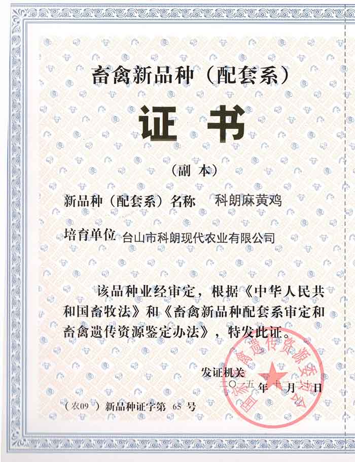 近日,集團分公司臺山市科朗現代農業有限公司培育的“科朗麻黃雞” 通過了國家畜禽遺傳資源委員會審定,被認定為:畜禽新品種(配套系)。