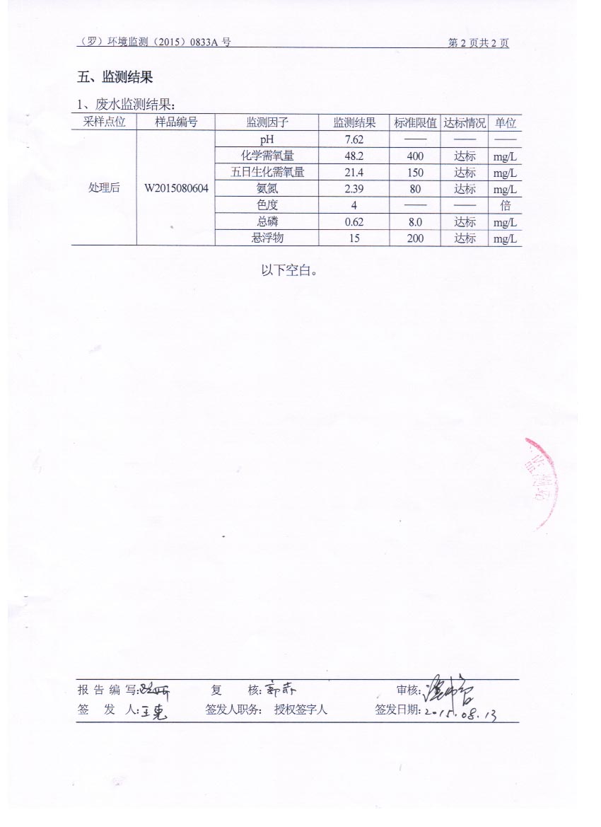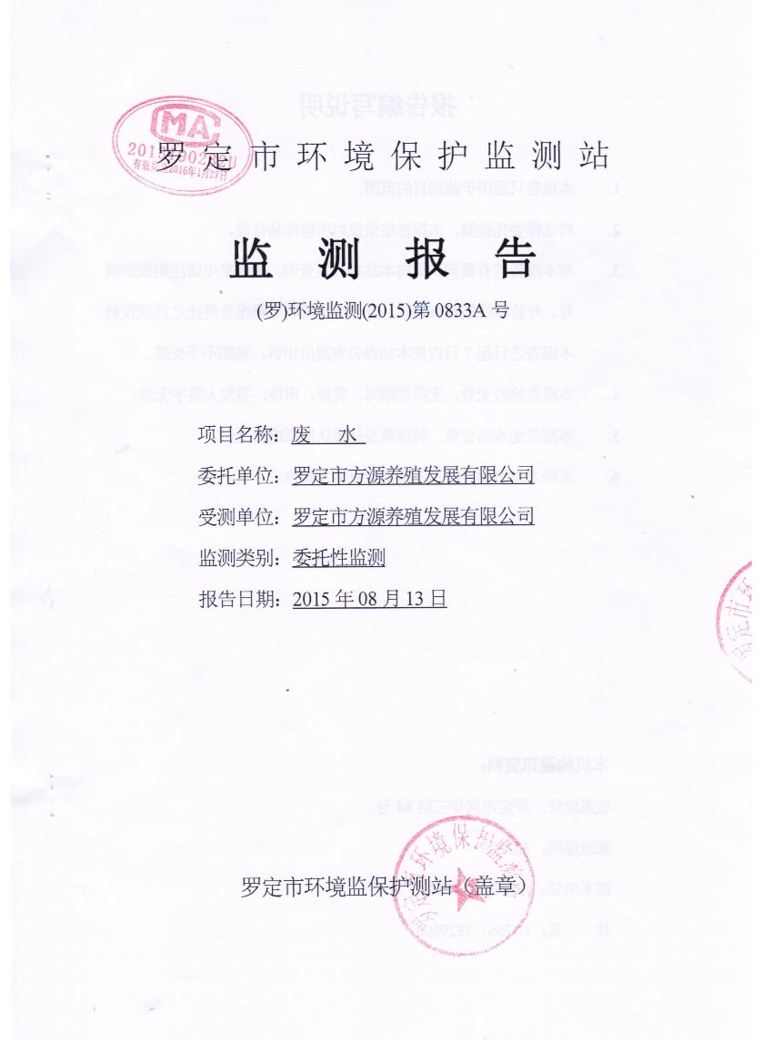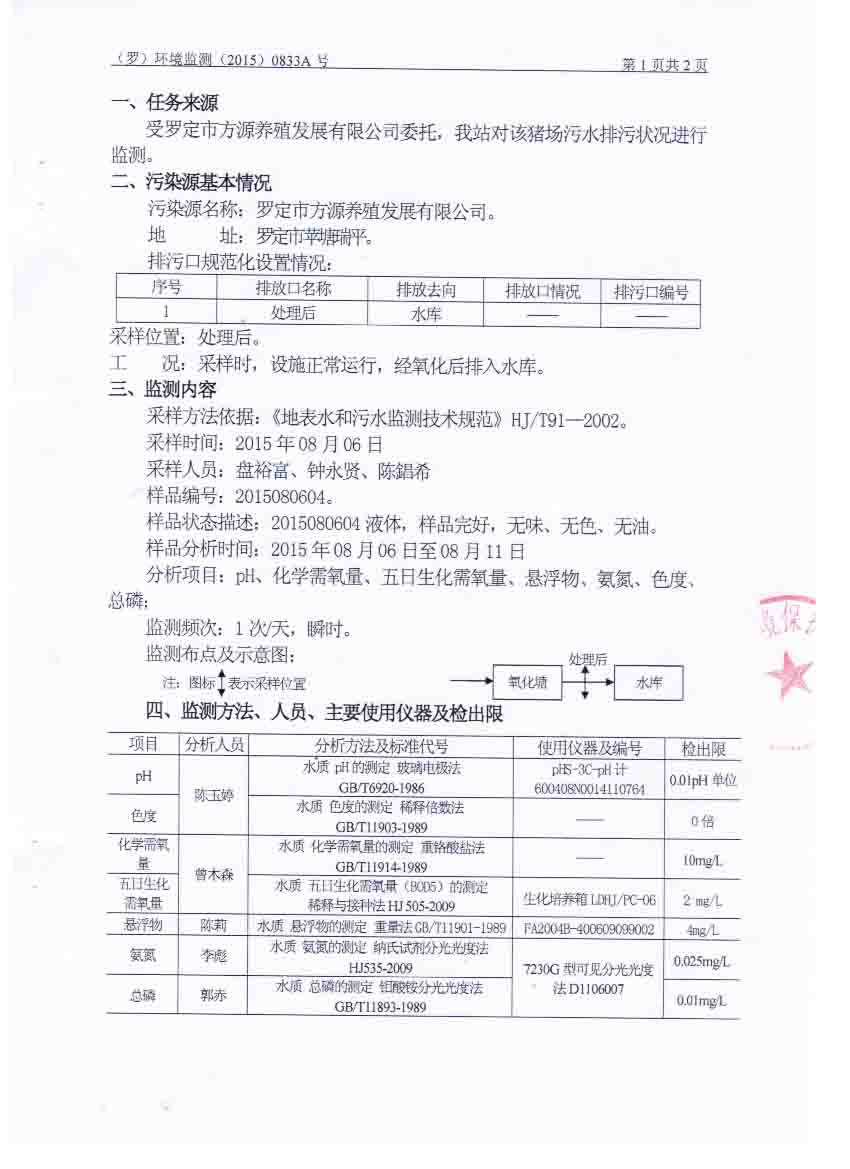 羅定市方源養(yǎng)殖發(fā)展有限公司2015年8月監(jiān)測(cè)報(bào)告