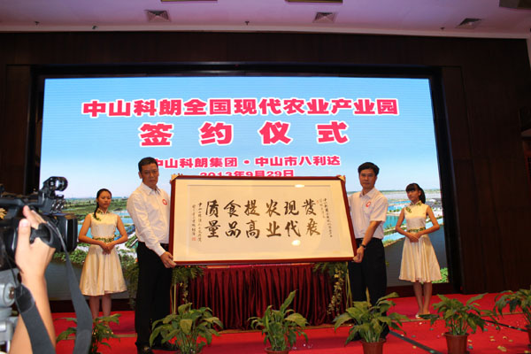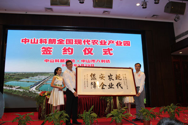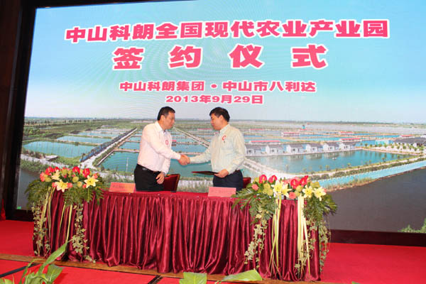 2013年9月29日,中山科朗集團與中山市八利達物業(yè)發(fā)展有限公司在中山市小欖人家酒樓隆重舉行中山科朗全國現(xiàn)代農(nóng)業(yè)產(chǎn)業(yè)園簽約儀式。中山市人大常委會副主任黃標泉,中山市人民政府副秘書長鄧志軍, 中共中山市小欖鎮(zhèn)黨委書記、鎮(zhèn)人大主席彭志輝, 中共中山市小欖鎮(zhèn)黨委委員孫順強、林國榮以及小欖鎮(zhèn)經(jīng)信局、農(nóng)業(yè)局、發(fā)改局等相關(guān)領(lǐng)導(dǎo)出席了簽約儀式。