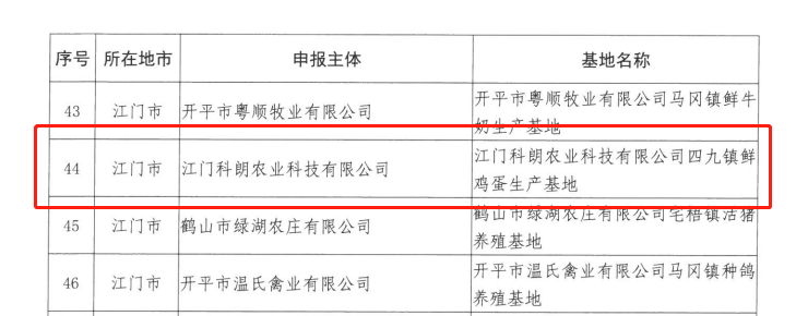 為深化我省農業國際貿易合作,推進粵港澳大灣區“菜籃子”供應體系建設,用好“兩種資源、兩個市場”,推動廣東省農產品貿易優進優出,2019年9月,廣東省農業農村廳、海關總署廣東分署啟動廣東省農產品出口示范基地認定工作,經專家審核、實地考察等層層審核。近期,廣東省農業農村廳傳來喜訊:科朗集團旗下江門科朗農業科技有限公司四九鮮雞蛋生產基地被認定為“廣東省農產品出口示范基地”(初評認定)。