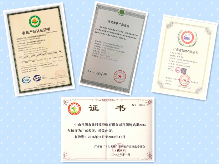 多年來,科朗一直在推行養殖標準化,健全管理制度,做好技術服務,強化典型示范,進一步促進現代農業健康發展。通過改進養殖生產方式、改善養殖環境、加強基礎設施和支撐體系建設,保護生態環境的同時為市民“菜籃子”工程提供了安全的禽蛋產品。目前,科朗產品先后獲得“無公害農產品”、“廣東省名牌產品”、“有機產品”、“廣東名蛋”等認證,品質經得起檢驗!
